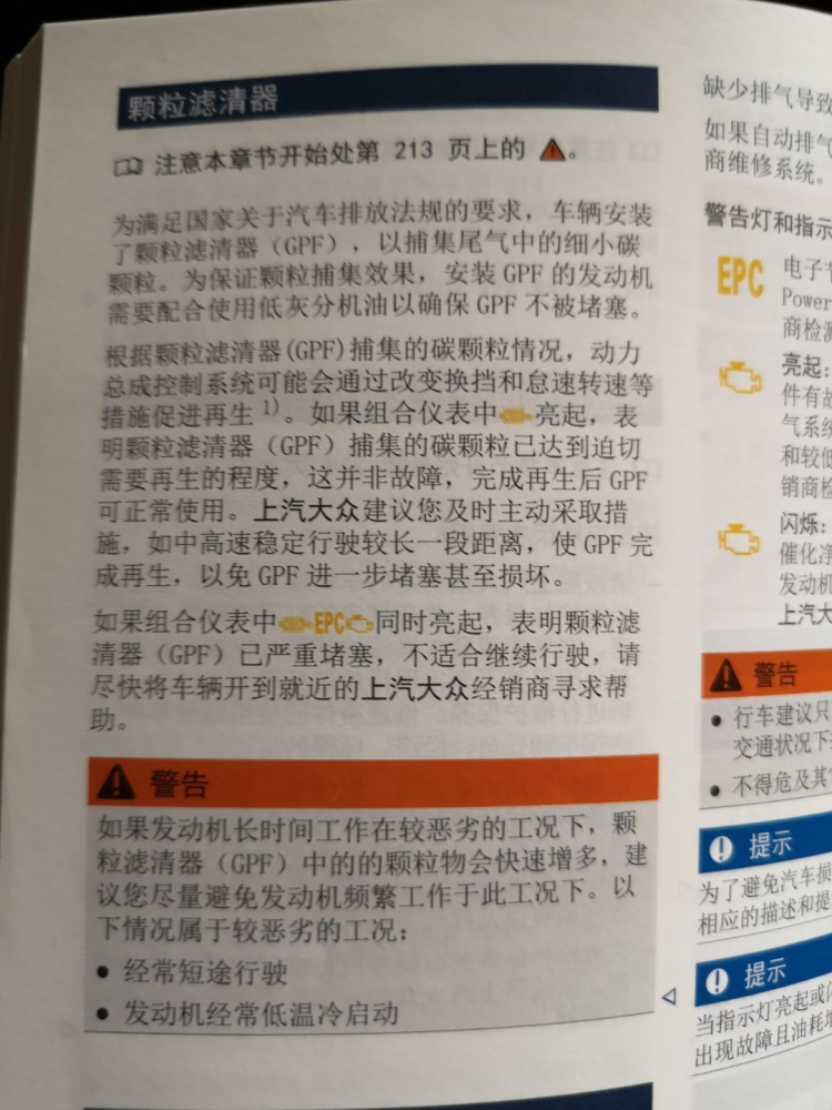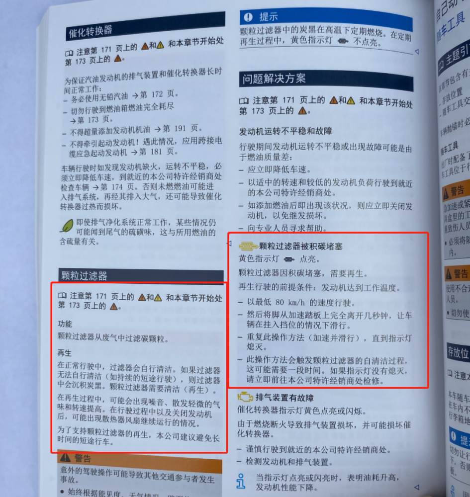对此,经销商和探岳的产品说明书里都表示,如果堵了,就去高速跑两圈,使颗粒捕捉器完成再生。而且2020款和2021款车型产品说明书清楚的说明了:如果发动机长期在恶劣路况行驶,会造成颗粒捕捉器堵塞,其中恶劣工况包括短途行驶和经常低温冷启动。这两种说明其实都在告诉消费者,在发动机温度没有达到正常的情况下,气缸内的汽油不能充分燃烧,所以会堵。