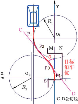基于路径规划和经验知识相结合,既具备路径规划的精确性,又兼容了经验知识模糊控制的鲁棒性,是当前业界深入探研的方案。如图13所示,设计一条圆弧加公切线的泊车规划路径。在该路径上选取4个关键点(P1、P2、P3 和P4)作为姿态调整的目标。