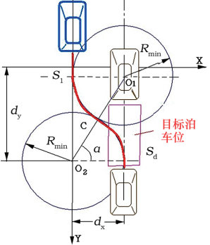 平行泊车常用的是确定公法线加相切圆弧的方案规划设计一条可行的企望路径轨迹,操控车辆沿企望的路径运动进入目标停车位,如图12所示。