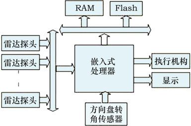 CPU对数据分析处理,根据车辆当前位置、目标位置及周围环境参数作出自主泊车策略,并转换成电信号;