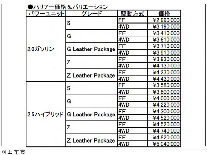 据悉,丰田Harrier在日本本土市场提供2.0L自然吸气(126kW/209N·m)和2.5L油混(综合163kW/221N·m)两种不同动力,其中2.0L版本的价格区间为299万至443万日元(约合人民币17.54万至25.99万元),混动版本的价格范围为358万至504万日元(约合人民币21万至29.57万元)。国产后,考虑到RAV4的售价和该车的定位,全新Harrier的纯燃油版本起售价预计会在21万元左右,混动版本起售价预计会在25万元左右。