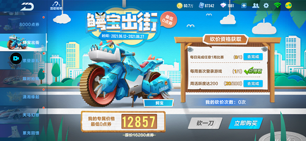 M1级摩托车鳄宝可通过活动中获得,在6月12日-6月27日期间,车手们完成任务获得砍价资格,最低可砍至0点券获得鳄宝(永久)。当未砍至最低价格时,也可以选择通过消耗点券进行购买。
