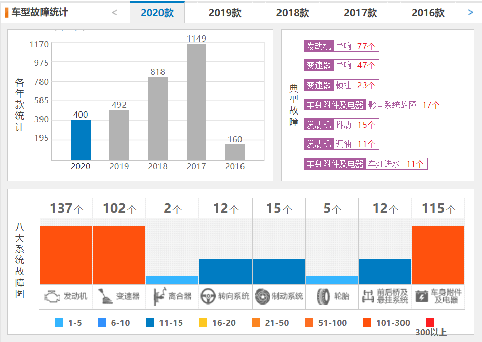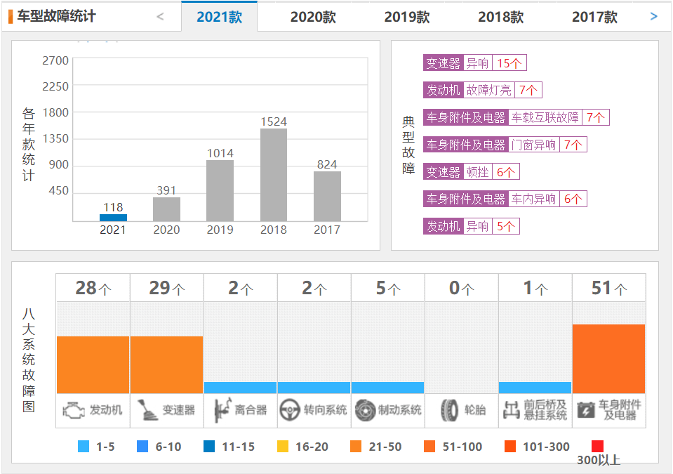 此外,奥迪A4L由于发动机漏防冻液、变速箱异响等问题,成为榜单中唯一上榜的豪华车型。