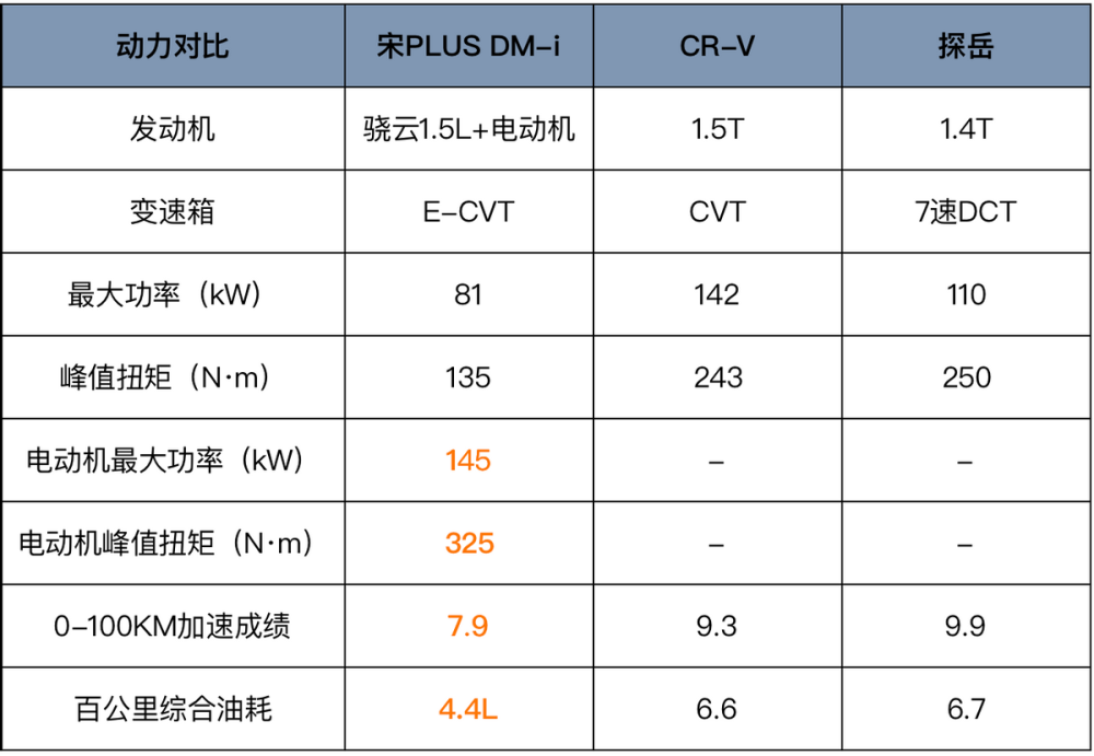 相比静态上的差异,三款产品的动态表现,我相信很多人都能直观感受出来。不同于燃油车,搭载了DM-i技术的宋PLUS DM-i给我的感觉就是提速直接爽快、动力响应迅速、持续输出有劲。八个字:油门跟脚,动力充沛。可以说,宋PLUS DM-i独特的混动技术,既赋予了这款车纯电般爽快的加速性能,同时又保留了燃油般扎实的巡航动力。所以,我们能看到宋PLUS DM-i的零百加速成绩为7.9秒,而CR-V和探岳的数据分别是9.3秒和9.9秒。