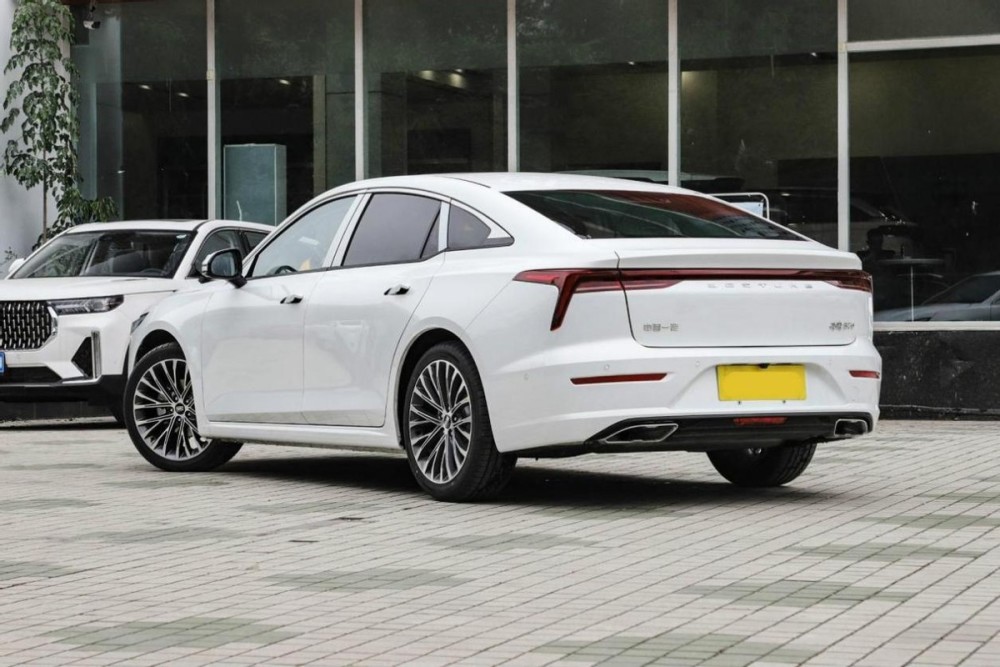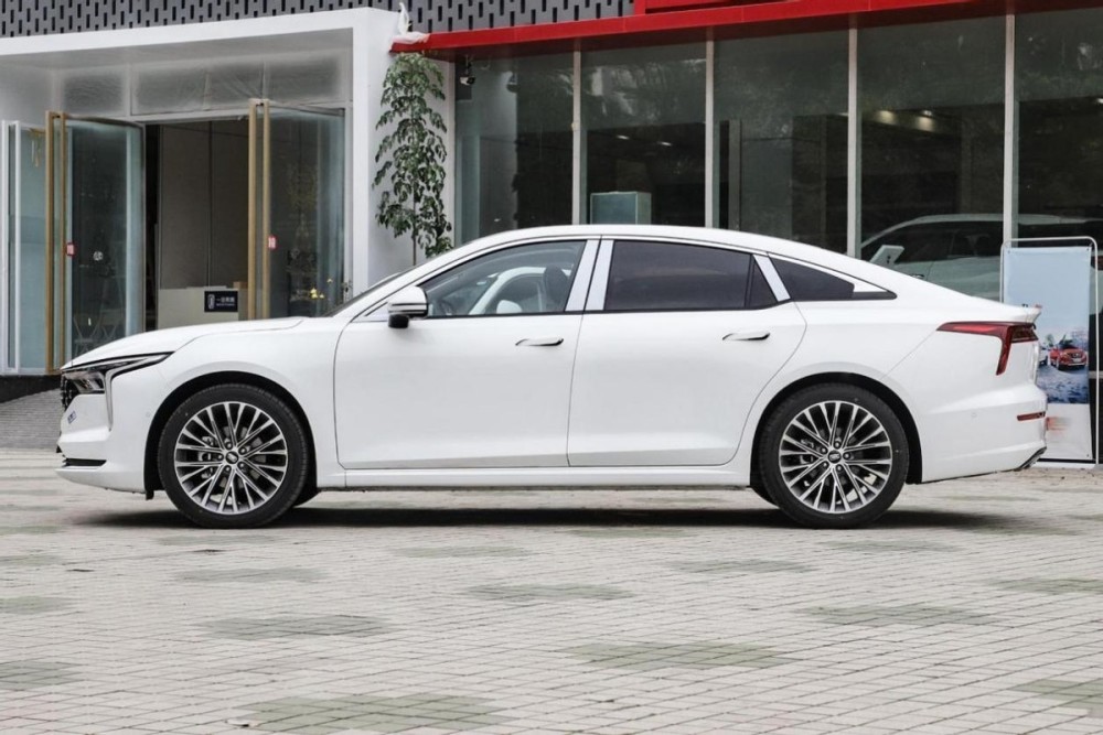 车侧的造型非常平整,腰线设计虽然并不突出,但一条前后贯穿的窗框线却起到了丰富细节的作用,不仅让前后翼子板更加突出,平直的设计也让车身看上去更加修长。大溜背造型在这个级别车型中较为少见,流畅的的造型看上去颇为舒展,搭配上尺寸较大的轮圈,也带来了不少的运动气息。