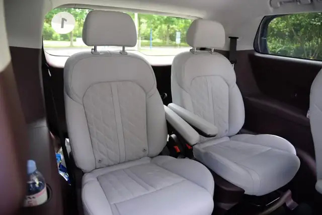 第三排的两个独立座椅可以前后滑动、调节座椅靠背倾斜角最多达146度并配有6挡可调的独立扶手。难得的是,这里也有座椅加热和通风功能,并配两个USB充电接口。座椅的安装位置更高,前方视野一览无余:当然这带来了一点副作用,那就是对于高个子来说,第三排的头部空间就不是特别的充裕了。