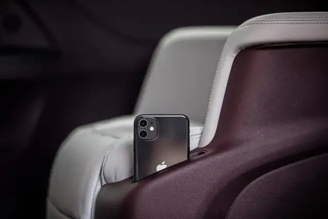 落座在第二排,这里的两个独立座椅无疑是这款车里最核心的位置,它们不仅和其它位置的座椅一样由质感极佳的进口牛皮覆盖,表面形成“全粒面”并以菱形纹理进行点缀,这次还增加了可以存放手机的插槽和USB充电口。为了照顾多数人的使用习惯,之前位于座椅外侧的调节按钮移至了内侧。
