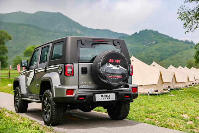 同时前脸采用了黑化的中网、前唇,配合两个红色拖车钩,透出野性气息。车身侧面矩形车窗、外露式铰链以及铆钉,搭配黑化17英寸轮毂和红色卡钳,让视觉效果充满气势感,又透露出几分狂野。离地间隙更是达到了220mm,进一步加强了山岭和沟壑的通过性。车尾则简洁有型,LED尾灯视觉效果醒目,而后挂式备胎的加入,以及侧开尾门设计和下方两端红色拖车钩,又进一步提升了整车越野氛围的营造。值得一提的是,作为限量供应,BJ40环塔冠军版每辆车都有独一无二的编码,每台都是唯一,给足用户专属感。