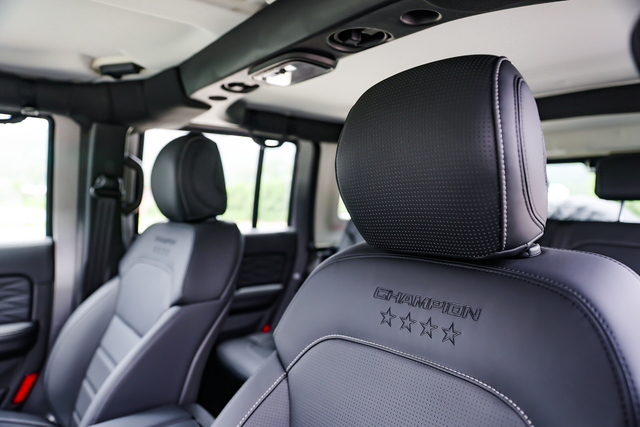 进入车内,BJ40环塔冠军版的内饰呈现出了硬派越野车少见的精致感,双色内饰配色,搭配大面积皮质包裹和缝线的运用,以及细节处镀铬饰条点缀,营造出不错的豪华氛围。而平底式三辐式多功能方向盘握柄处采用了打孔皮质包裹,配合精致的电子档把,使其质感更为突出,加上12.3英寸全液晶仪表+10英寸悬浮式中控屏,则带来满满的科技气息。为了进一步彰显其独特的身份,其中副驾手套箱部位带有环塔图案和“CHAMPION”标识,座椅刺绣着“CHAMPION”字样和四星图案,每处细节都显得仪式感满满。