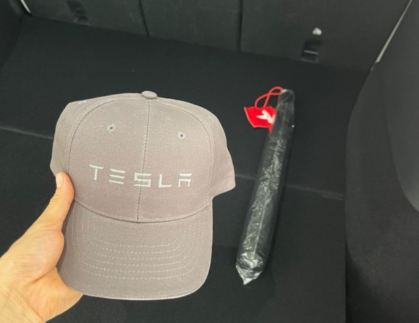 买车时还赠送了棒球帽,上面有特斯拉的logo,还有一把雨伞,回家后车主将其送给了环卫工人,他说:“回家路上刚好下起了雨,我看路边有一位环卫工人没有雨伞,于是我就把这把雨伞和帽子送给了他,希望能帮助他,因为环卫工人也很辛苦,默默为城市奉献。”