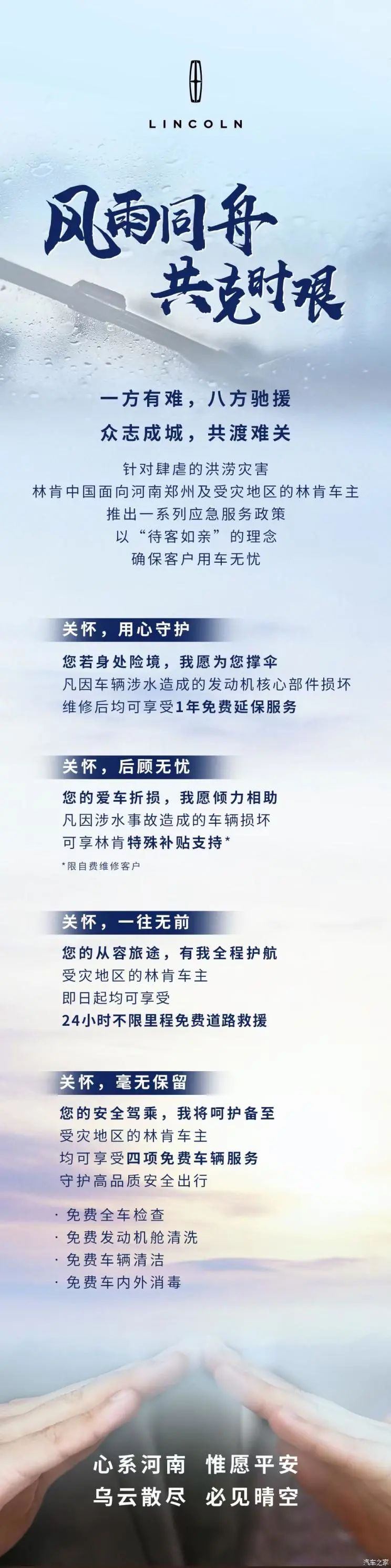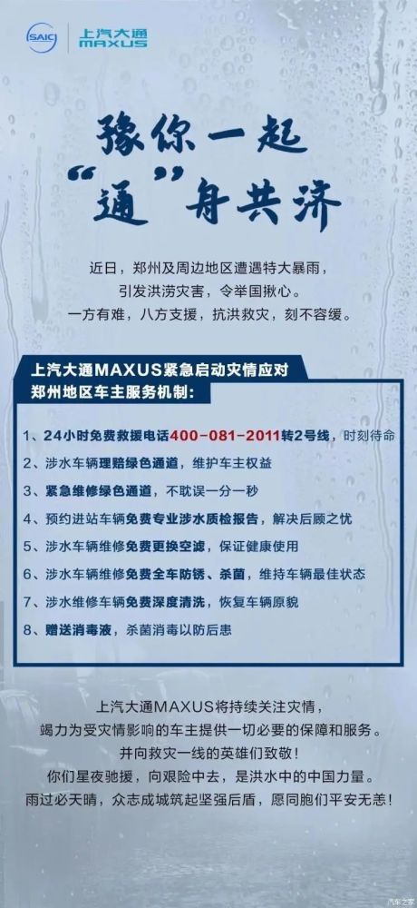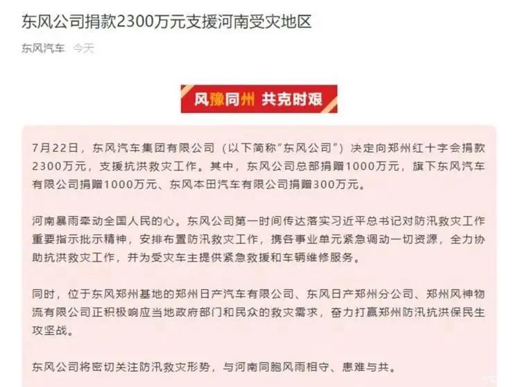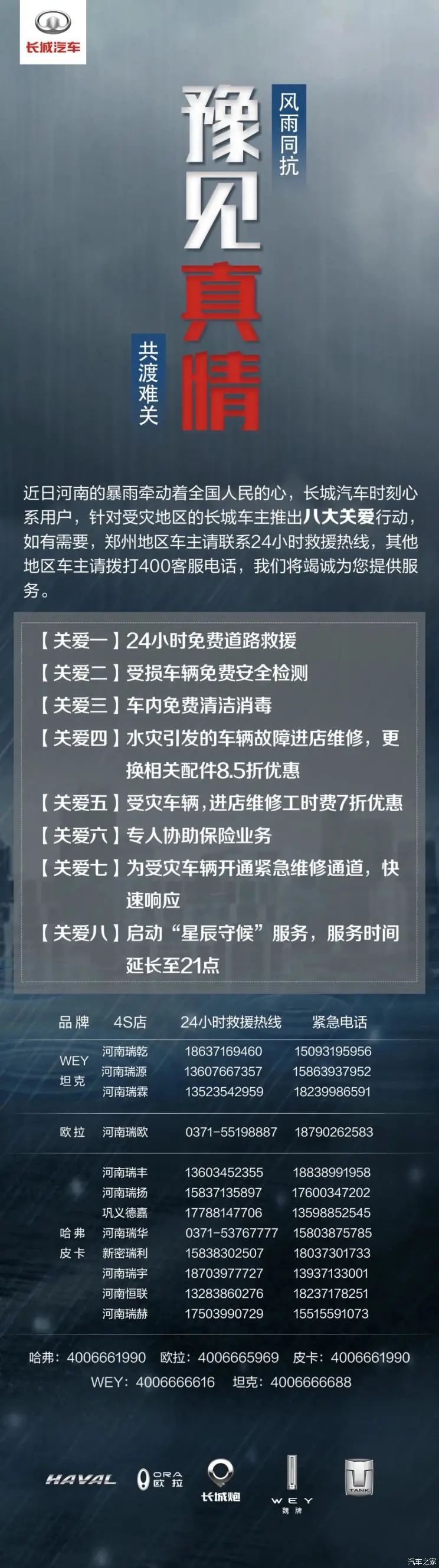 在河南省暴雨灾害发生后,大批车企主动响应,积极捐款捐物,并对河南省车主推出了救援服务/关怀计划。