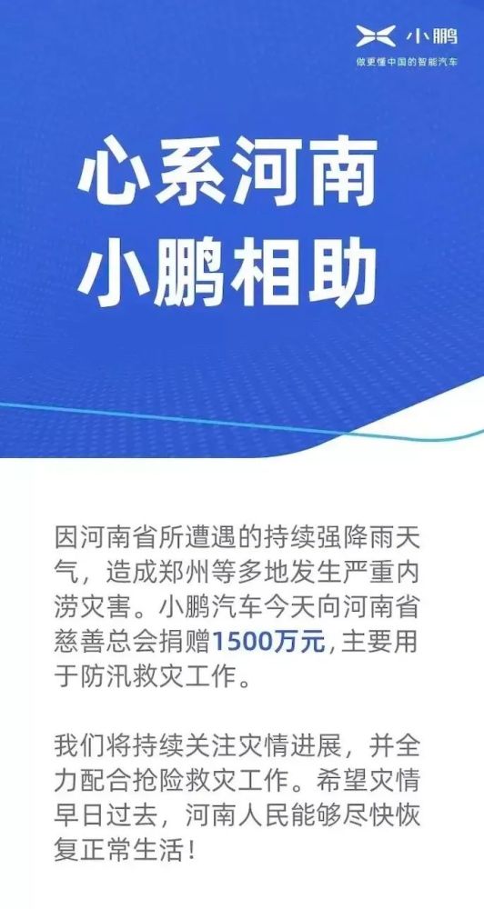 7月21日,小鹏汽车宣布向河南省慈善总会捐赠1500万元,主要用于防汛救灾工作。