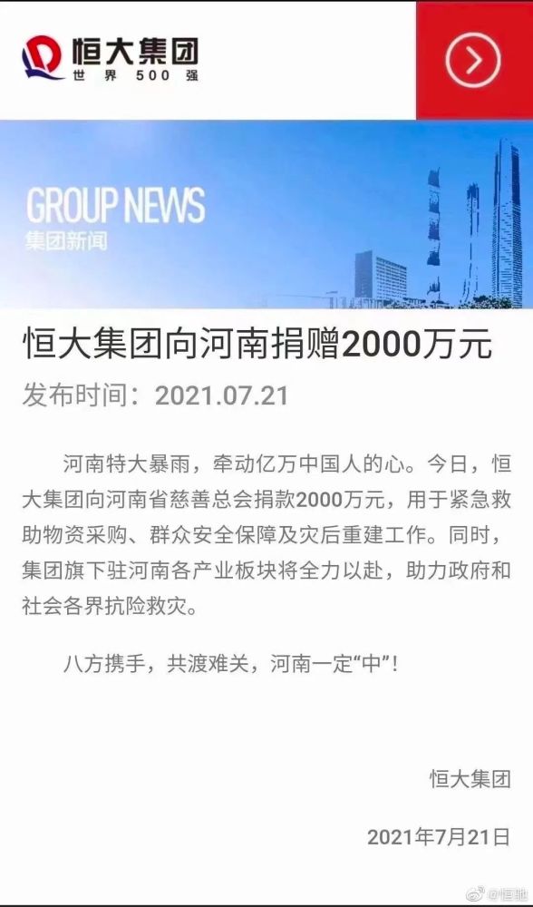 7月21日,恒驰汽车的官方微博发布公告,恒大集团向河南省慈善总会捐款2000万元,用于紧急救助物资采购、群众安全保障及灾后重建工作。同时,集团旗下驻河南各产业板块将全力以赴,助力抢抗险救灾工作。
