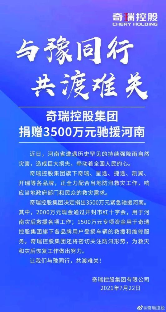 7月22日,奇瑞控股集团对外公开表示,将捐出3500万元驰援河南。其中,2000万元现金将通过开封市红十字会,用于河南灾后各项工作;1500万元专项资金,用于奇瑞控股集团旗下各品牌用户受损车辆的救援和维修服务。