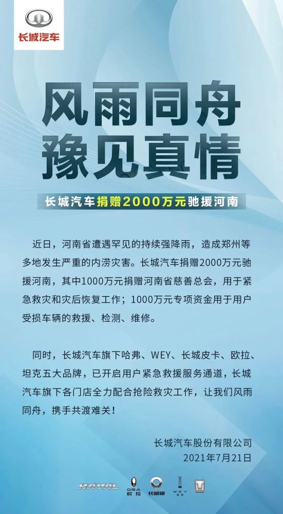 7月21日,长城汽车宣布捐赠2000万元驰援河南,其中1000万元捐赠河南省慈善总会,用于紧急救灾和灾后恢复工作;1000万元专项资金用于用户车辆受损的救援、检测、维修。与此同时,长城汽车旗下哈弗、WEY、长城皮卡、欧拉、坦克五大品牌,已开启用户紧急救援服务通道。长城汽车旗下各门店,也将全力配合抢险救灾工作。