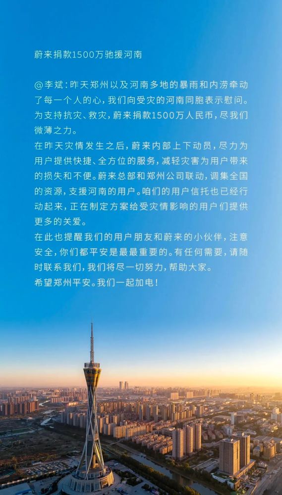 7月21日,蔚来汽车创始人、董事长、首席执行官李斌公开表示,捐款1500万元驰援河南,并与郑州公司联动,支援河南用户。