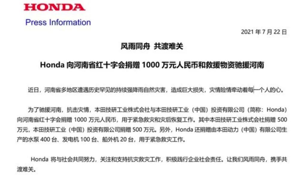 7月22日,本田中国官方发布:本田技研工业株式会社与本田技研工业(中国)投资有限公司(简称:Honda) 向河南省红十字会捐赠1000万元人民币,另外还有各种救援物资。
