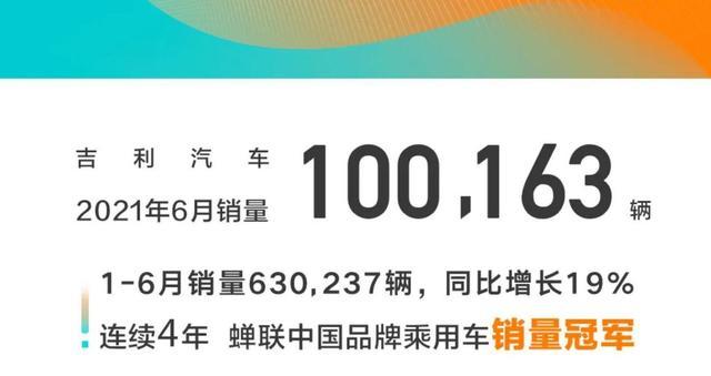 在乘联会发布的6月销量排行榜中,吉利以100,163辆的成绩位居国内乘用车第二名,仅次于一汽大众。今年2月,吉利推出了两个新蓝色吉利行动计划,一是吉利旗下所有车型,未来新能源混合动力汽车要占90%,剩下的10%为传统节能小排量汽车;二是打造纯电动智能汽车,参与面向未来市场的竞争。