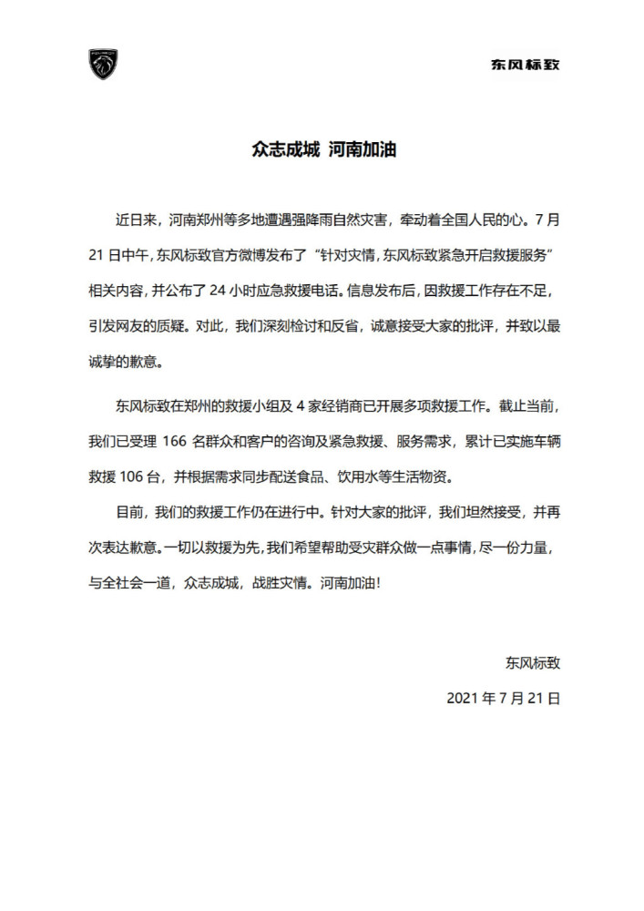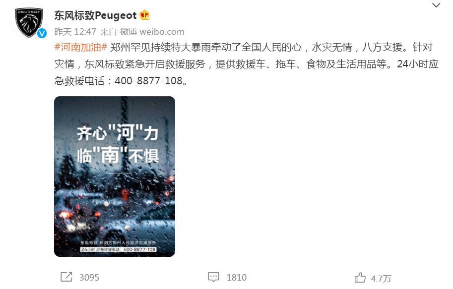 正如我们上述所言,厂商对受灾车主做出的承诺,很大程度上取决于经销商的执行力度,而国内很多经销商和厂商的关系是加盟,就像是可口可乐和小区门口的小卖部的关系一样,厂商推出相关的方案,经销商未必能严格执行。比如7月21日中午12点47分东风标致官方未必发布消息表示,东风标致紧急开通救援服务,提供救援车、拖车、食物和生活用品等,并公布了救援电话。但是有网友和车主拨打救援电话,得到的答复是官方未开通该服务,不提供救援和物资。这一情况被网友关注,东风标致也被质疑“发布虚假救援宣传”、“蹭灾情热度”,一时间舆情一片哗然!