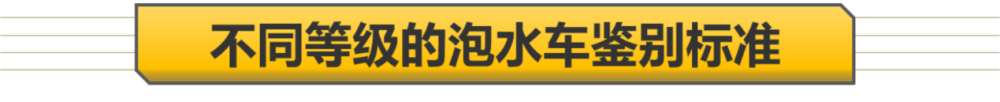 虽说都叫泡水车,但是泡水也要看等级,不是说所有泡水车都不能买。我们大致可以将泡水车分成几个等级,为了方便阅读,我们稍微简化了一下,懂行的朋友就别计较啦。需要注意的是部分情况下水位并没有到达车辆的底盘处,理论上不需要特别整修,只要关注一下轮胎和刹车盘的状况,我们就不计入泡水车的范畴内了。