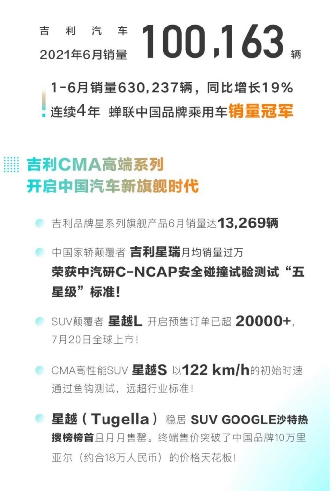它们有多能打?我们先来看一下数据:吉利汽车2021年6月销量100163辆,环比增长4%;1-6月总销量630237辆,同比增长19%,完成全年153万辆销量目标的41%,连续4年蝉联中国品牌乘用车销量冠军。