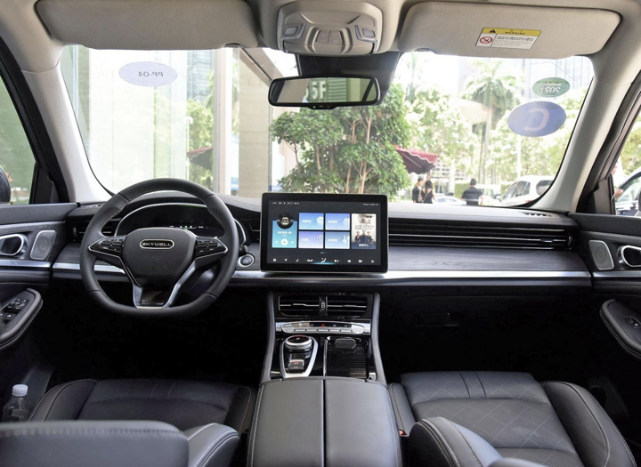 进入车内,创维ET5采用对称式中控布局,整体质感非常不错,简洁大气。新车配备12.3英寸全液晶仪表(低配为8英寸),配合中控12.8英寸的多媒体显示屏,并搭载创维Skylink智能网联系统,为内饰增添了很强的科技质感。配置方面,像ABS、EBD、TCS、自动驻车、陡坡缓降、LED前大灯、无钥匙启动等主流配置都在该车上有所体现。