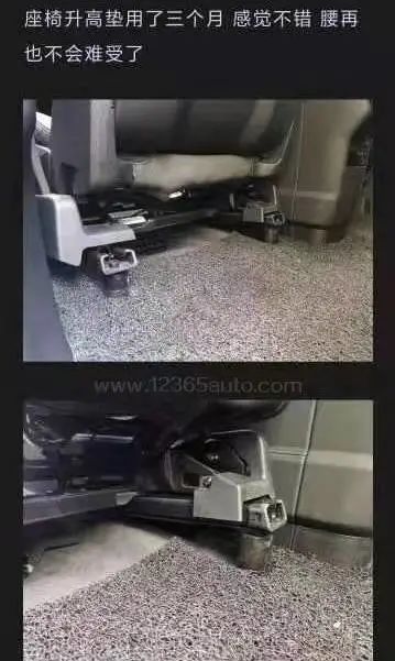 有车主得意地晒出图片,在一把座椅底盘的滑轨后部,硬生生塞进去一块圆柱状的增高垫块,在杠杆原理的作用下,原本跟地面贴合的座椅,悬空了,座椅的倾斜角度被改变。