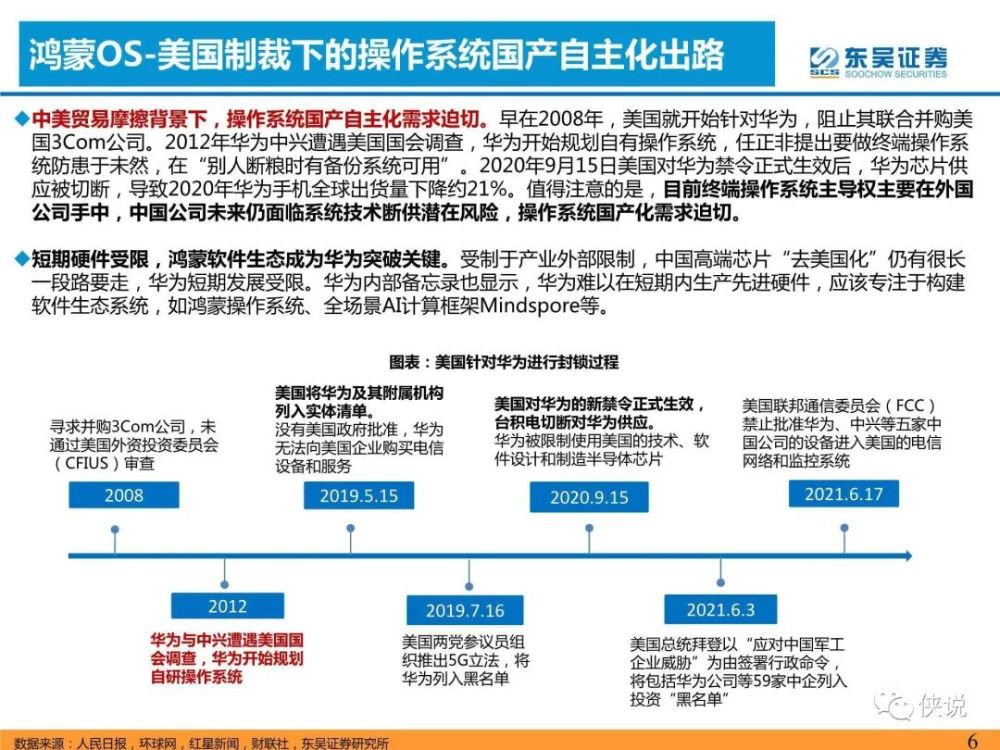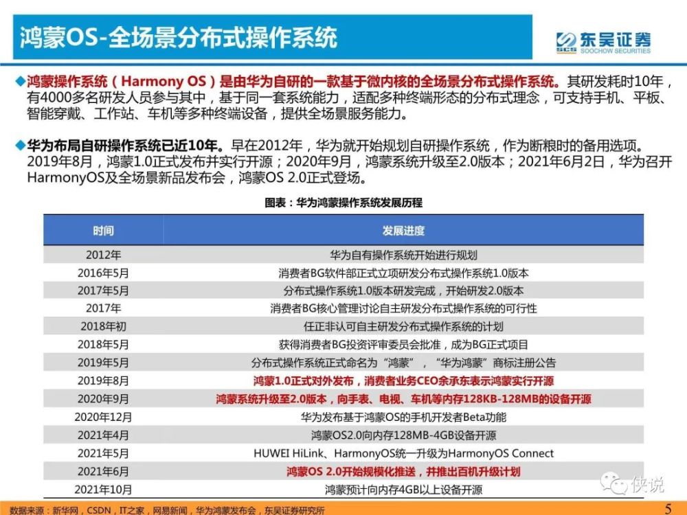华为布局自研操作系统已近10年。早在2012年,华为就开始规划自研操作系统,作为断粮时的备用选项。 2019年8月,鸿蒙1.0正式发布并实行开源;2020年9月,鸿蒙系统升级至2.0版本;2021年6月2日,华为召开 HarmonyOS及全场景新品发布会,鸿蒙OS 2.0正式登场。