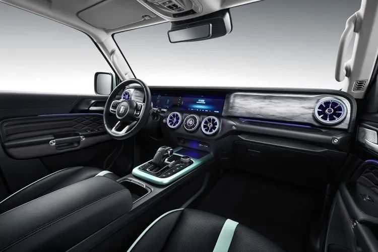 坐进车内,虽然中控布局变化不大,但新车在中控和座椅细节上加入了更多撞色搭配,配合更炫酷的内饰氛围灯,整个座舱氛围比越野版更活泼一些。