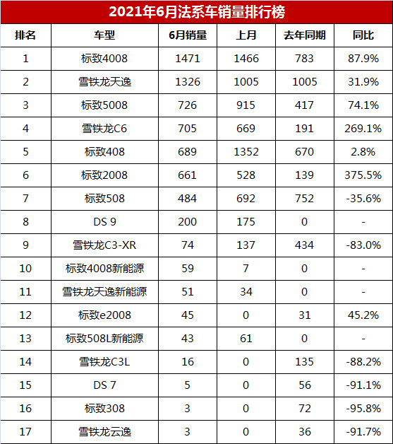 6月份,销量超过1千辆的法系车依然是标致4008和雪铁龙天逸。这两款车在三四月份都推出了2021款车型,新车在配置上有所升级,销量也略有增长。其中,标致4008销量1471辆,同比增长87.9%;雪铁龙天逸销量1326辆,同比增长31.99%。