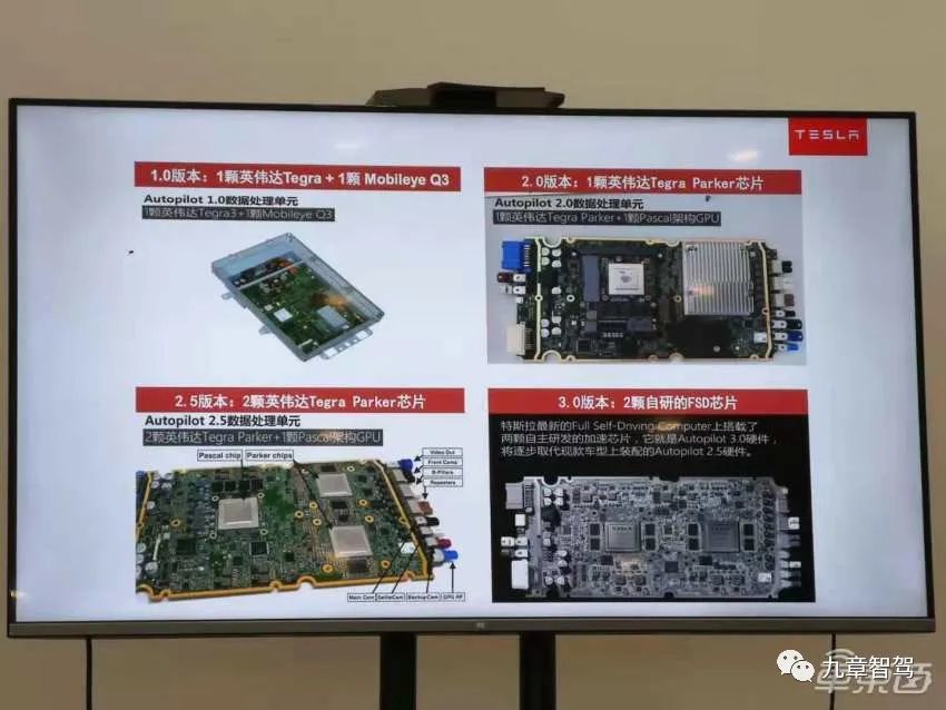 特斯拉之前采用的 HW1.0、HW2.0 和 HW2.5 硬件系统往往采用来自不同供应商的两颗不同类型的芯片作为“大脑”,分别处理并利用视觉信息和反射波信息做出决断。
