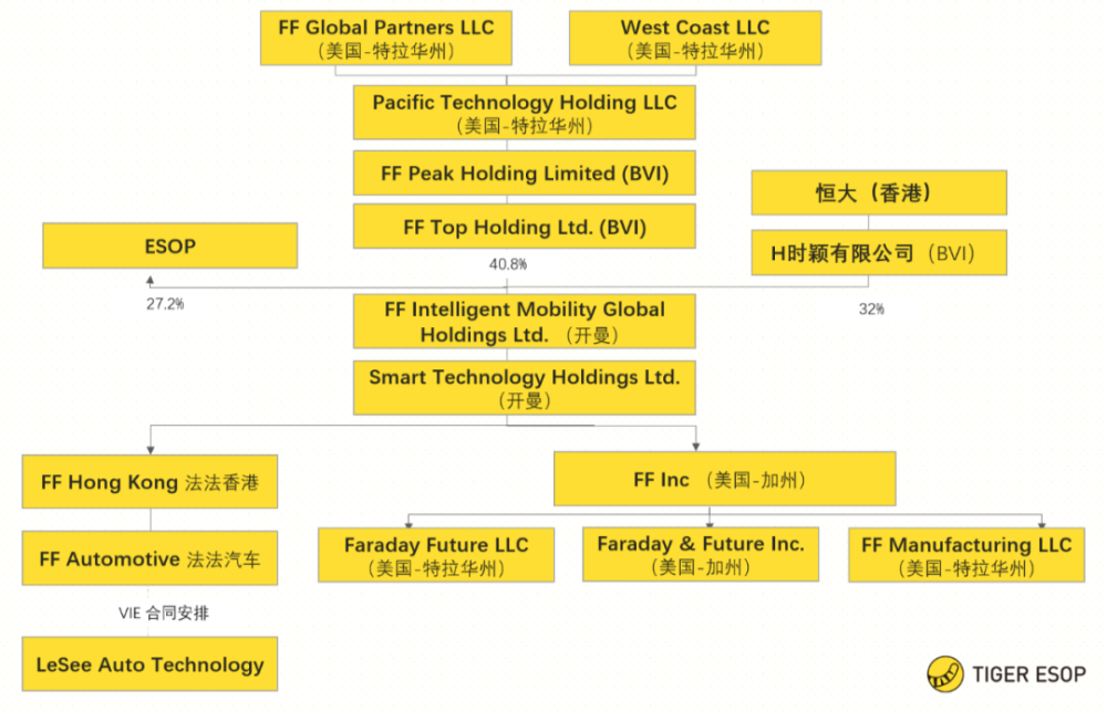 之后,为激励管理人员,贾跃亭参考阿里巴巴、咨询行业的合伙制度,通过FF GP以及其他三家中间控股公司实施了FF Intelligent合伙计划,合伙人以0.50 美元的单价,认购FF GP 的股权。