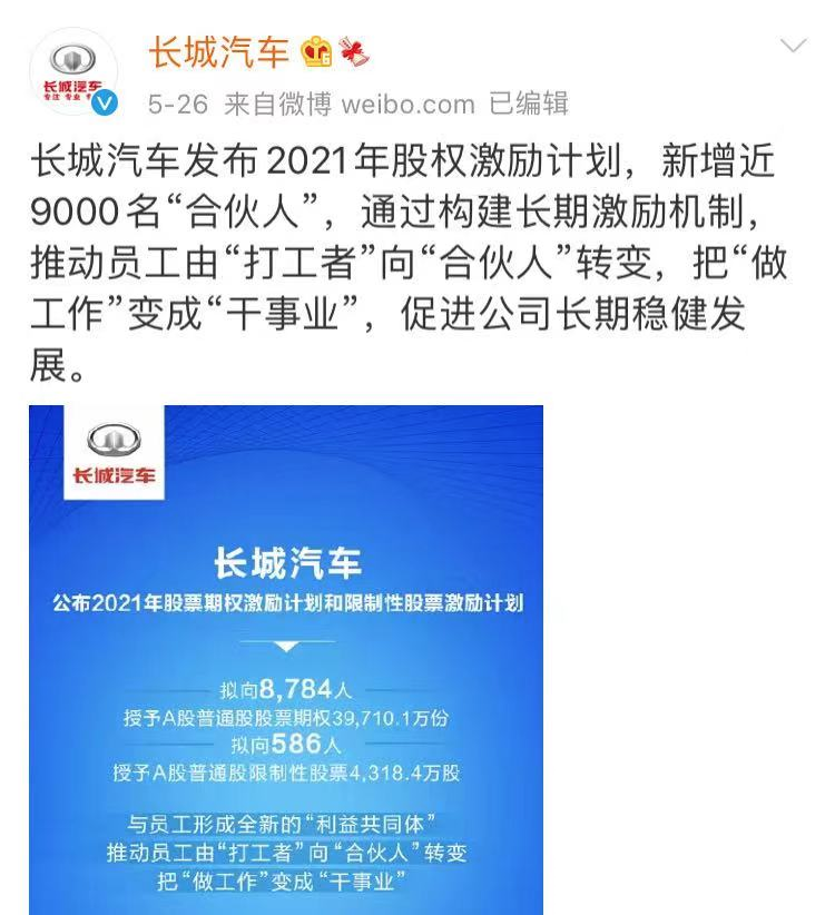 5月25日,长城汽车发布2021年股权激励计划,拟向8784人授予A股普通股股票期权39710.1万份,拟向586人授予限制性股票4318.4万股。授予对象包括中高管、董事和骨干。据悉,2020年和2021年,长城一共推出2期股权激励,累计覆盖超1万人。