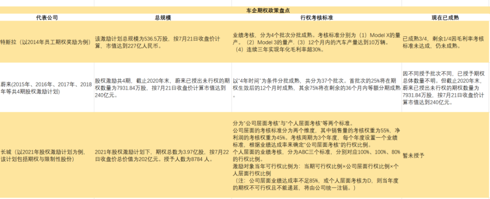 特斯拉以新车型量产、产量、毛利率等指标为考核标准,针对马斯克本人的期权甚至还以营收利润、市值为考核标准。长城的期权考核也偏向于销售量、利润、个人表现等方面。但蔚来汽车就偏向于时间锁定。