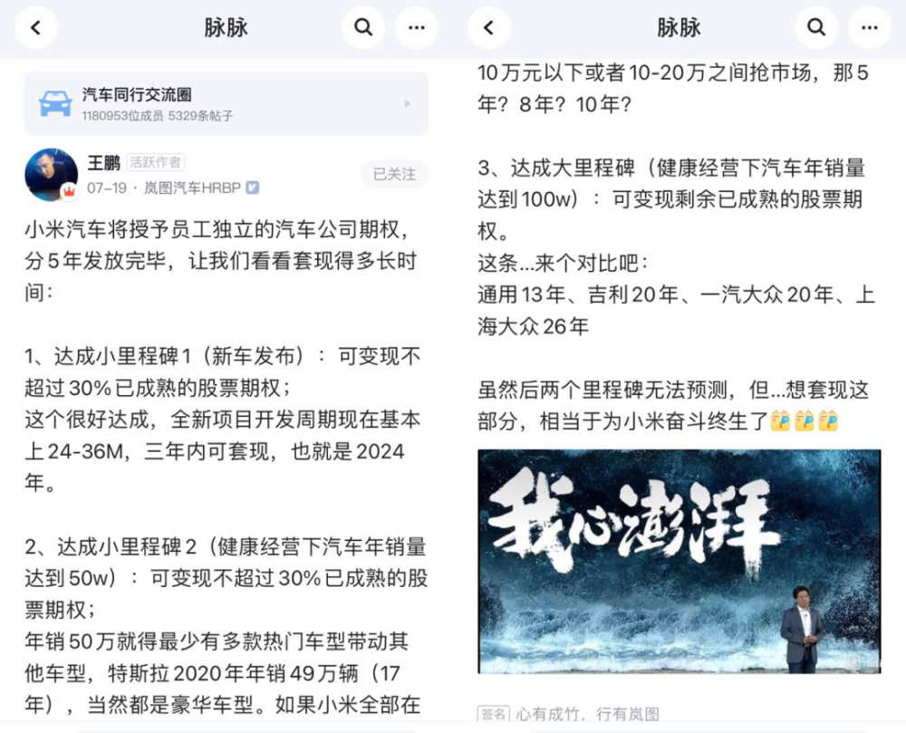 在小米汽车期权政策流出之后,岚图汽车HRBP王鹏在脉脉汽车同行交流圈里,详细算了算每个考核目标下,套现所需要的时间。