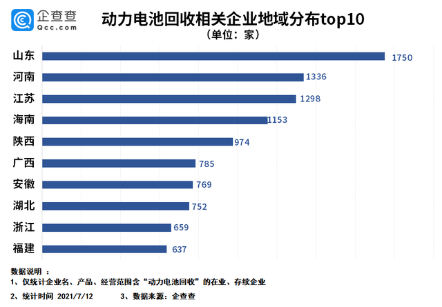 同样,这里还有一些其他数据值得我们注意。从省份层面来看,其中山东拥有最多的动力电池回收相关企业,共1750家排全国第一。河南排名第二,共1336家相关企业;江苏排名第三,有1298家相关企业。此外,海南省的企业也超过了1000家,位列第四。
