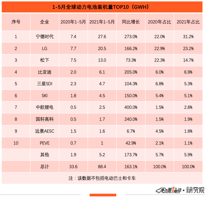 根据韩国市场研究机构SNE Research数据显示,今年5月全球动力电池装机量为19.7GWh,同比增长2.3倍。全球前十动力电池企业装机量为18.6GWh,市占率高达94.4%,市场集中度进一步提升,其中LG能源解决方案(简称LG能源)、宁德时代、松下、比亚迪、三星SDI分列前五。