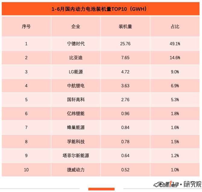 在中国市场,1-6月,宁德时代的市占率近50%,独霸冠军宝座;比亚迪市占率14.6%,位居第二;LG化学市占率9%,位居第三,其是TOP10中唯一一家外资企业。