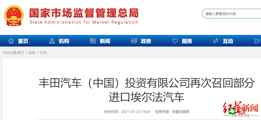 7月23日,天津一汽丰田、广汽丰田、保时捷(中国)汽车等车企,根据《缺陷汽车产品召回管理条例》和《缺陷汽车产品召回管理条例实施办法》的要求,向国家市场监督管理总局备案了召回计划,涉及卡罗拉、雷凌、埃尔法、Cayenne、Taycan等热门车型。