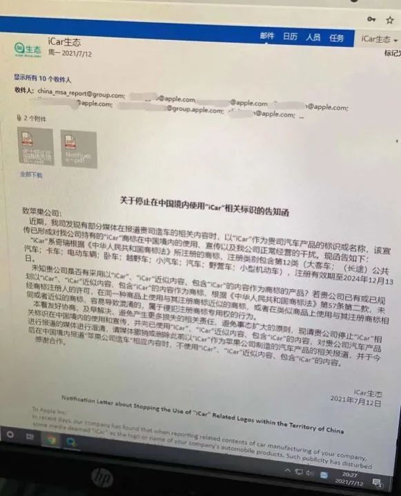 图片显示,一封《关于停止在中国境内使用“iCar”相关标识的告知函》被发送至多个域名为“apple.com”的电子邮箱,落款为“iCar生态”的邮件。从邮件可以看出几点信息:“iCar”商标是奇瑞依法注册的商标,苹果造车在中国境内不能使用“iCar”、“iCar近似内容”、包含“iCar”的内容进行宣传。
