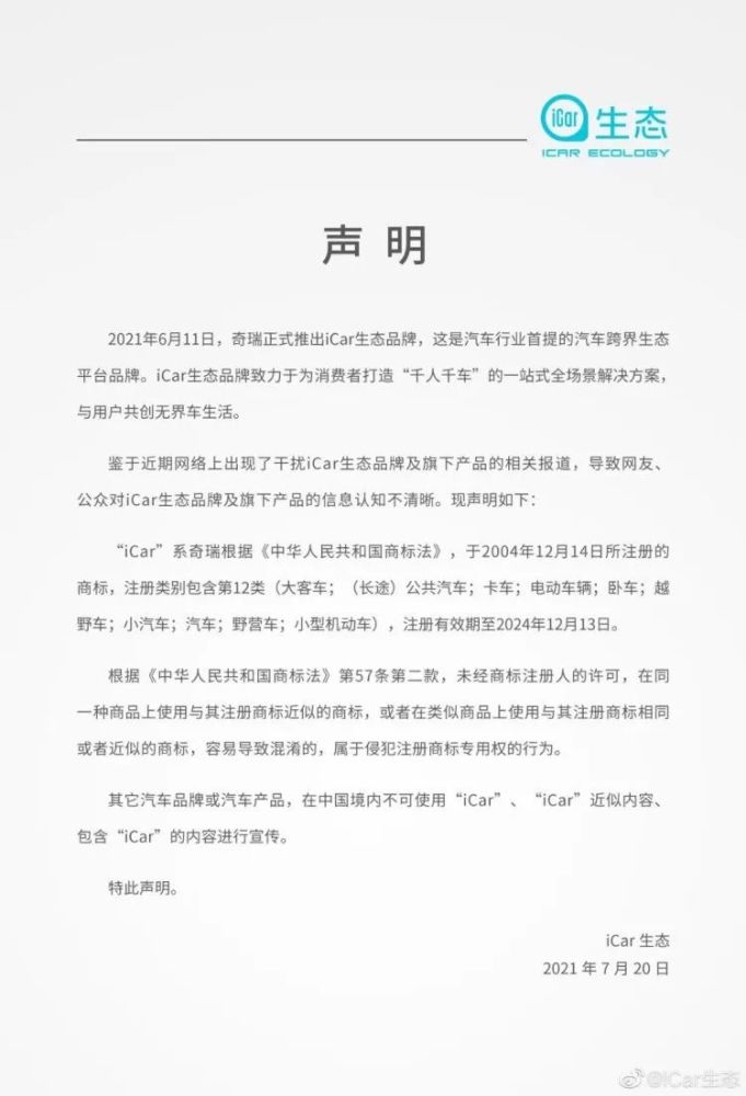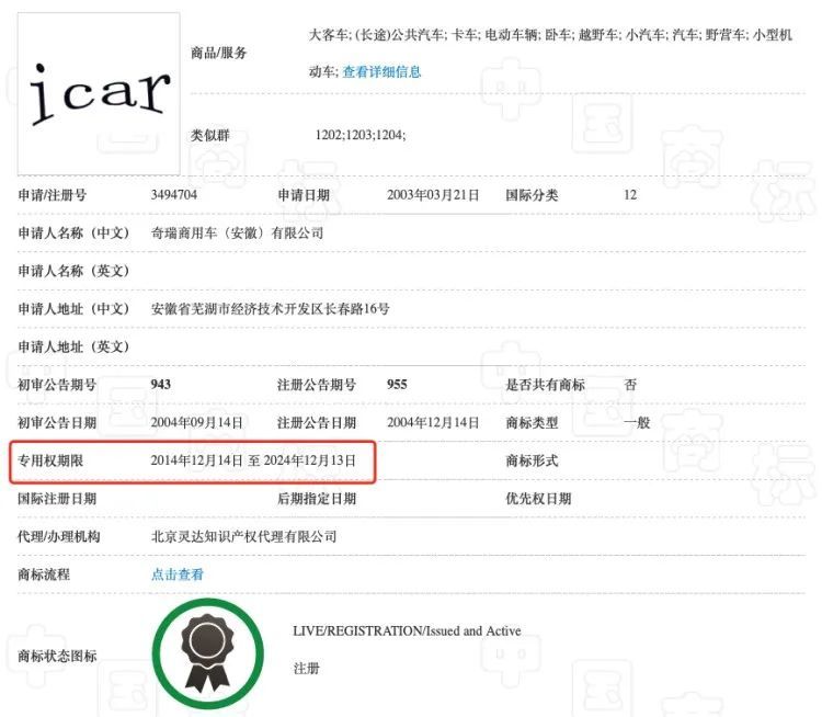 声明中表示,iCar系奇瑞于2004年12月14日注册的商标,有效期到2024年12月13日,类别包含大客车、(长途)公共汽车、卡车、电动车辆、卧车、越野车、小汽车、汽车、野营车、小型机动车。