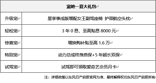 此外,本次上市发布会,东风日产启辰星还推出了超值“宠她一夏大礼包”,包含升级宠、轻松宠、惊喜宠、特别宠、试驾宠五重宠爱好礼:
