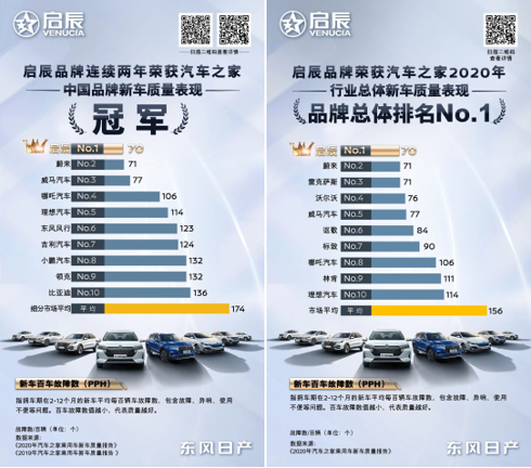东风日产启辰始终秉持用户至上,产品至上的原则,坚持在高品质造车的基础上,以“智·趣科技”赋能,为中国消费者带来更加欣喜、愉悦的用车生活。得益于对“高品质”的坚守,东风日产启辰不仅收获百万用户的信赖与选择,更是获得了市场的高度认可。2021年3月15日,在汽车之家正式发布的2020年度《汽车之家乘用车新车质量报告》中,东风日产启辰不仅斩获中国品牌新车质量表现排名NO.1,连续两年夺冠。同时勇夺2020年行业总体新车质量表现—品牌总体排名NO.1。