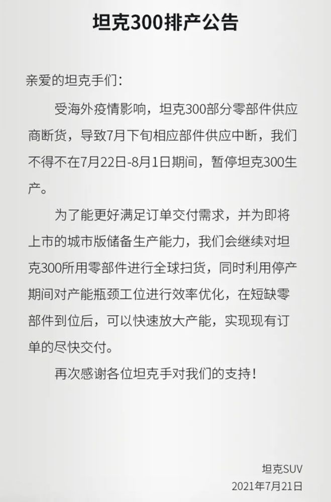 不过,由于海外疫情的缘故,坦克300部分零配件断供,所以最近坦克官方又宣布在7月22日至8月1日期间暂停生产坦克300车型,看来准车主们的提车时间又得延后了......