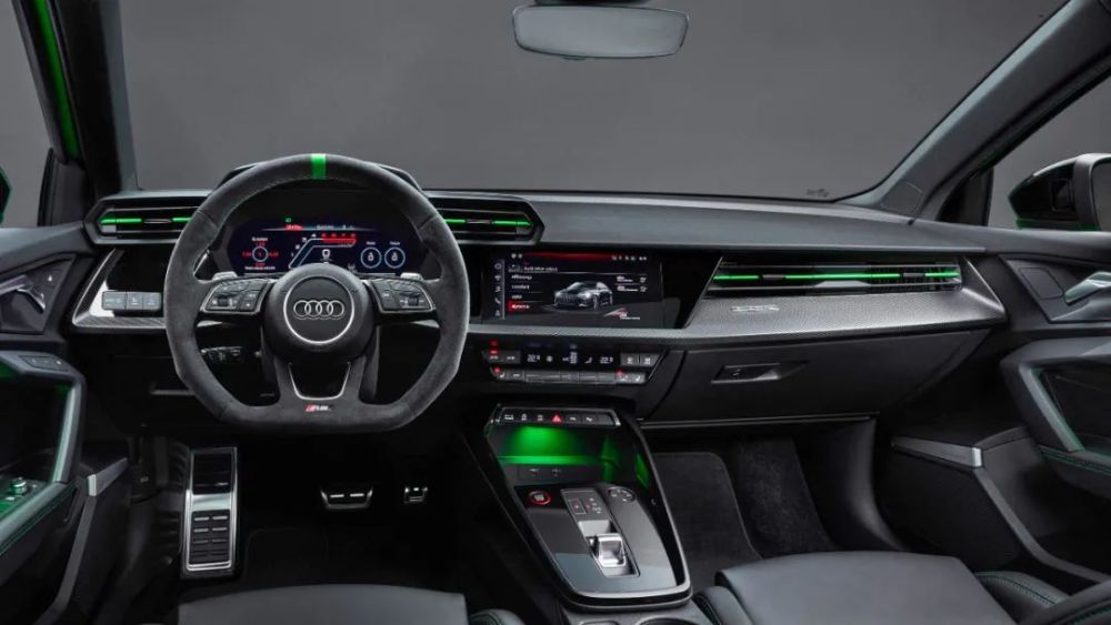 内饰部分变化不大,RS 3换用了平底Alcantara材质方向盘,并且在出风口、氛围灯等区域采用了荧光绿色设计,让车内显得更加活泼。
