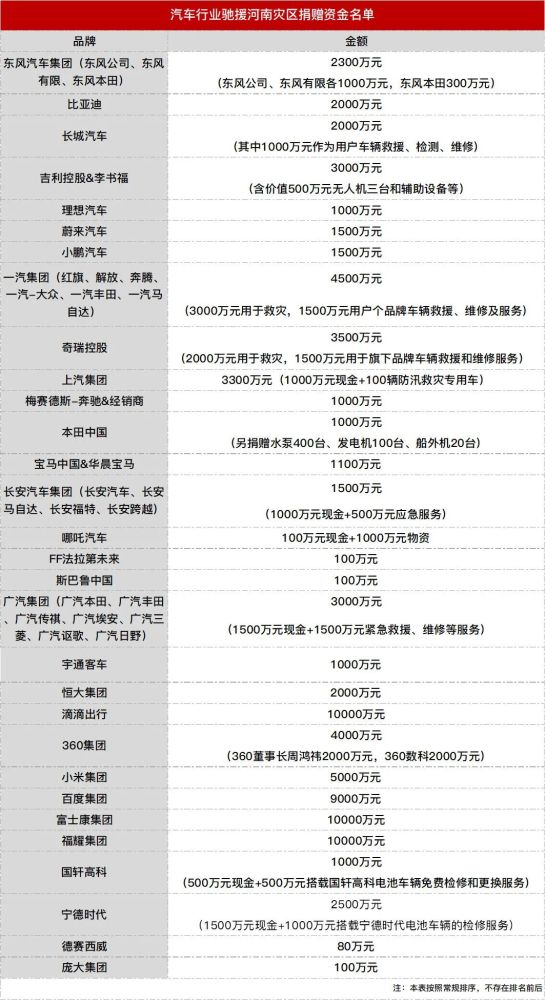 7月21日上午,理想汽车官方宣布向河南慈善总会捐款1000万元,用于抗洪救灾;随后小鹏汽车宣布捐款1500万元;蔚来捐款1500万元;吉利宣布捐款2500万元现金,以及价值500万元的救援设备;长城汽车宣布捐款2000万元,其中1000万捐给河南慈善总会,1000万用于受损车辆的维修、检测、救援;奇瑞汽车更是捐出了3500万元,其中2000万捐给开封市红十字会,1500万用于奇瑞集团旗下用户车辆的救援和维修;一汽集团携旗下红旗、解放、奔腾、一汽-大众、一汽丰田、一汽马自达共捐出4500万元;广汽集团携旗下各个品牌也捐出了3000万元;河南本地的车企宇通客车,也捐出1000万元,并且向河南省所有受灾的公交客运企业提供免费救援服务。