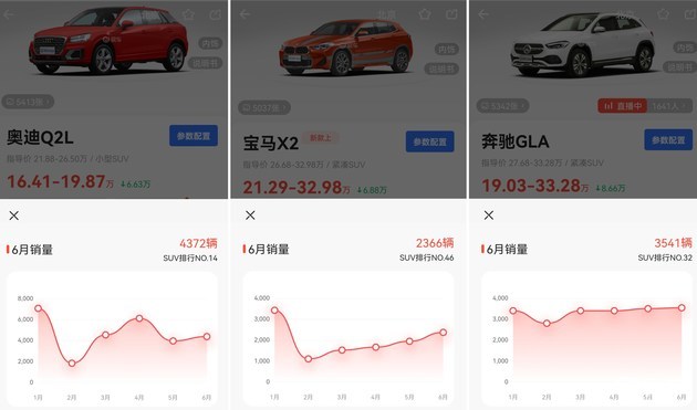 与Q2L售价有重合的竞品自然就是宝马X2和奔驰GLA了,从销量来看,Q2L 6月卖出4372辆,4月更是卖出了6000多辆。而6月GLA 为3541辆,X2只有2366辆。而且最重要的,这两款竞品打死也不可能20万元落地,优惠力度很小。所以性价比方面奥迪Q2L有明显优势。