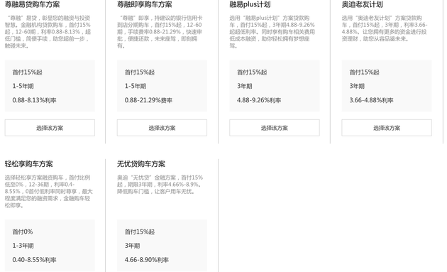 奥迪官方一共推出了6种金融政策,其中大部分是首付15%,1-5年期。也就是说最低不到5万块就能先把车开走了。还有一种是0首付,1-3年期,这种是完全无压力的,只需要缴纳必要的购置税、上牌费、保险和分期手续费即可开上爱车。