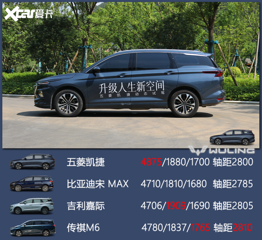 车侧十分修长,一条腰线由A柱下侧延伸至车尾与尾灯相融,让侧面看起来不再单调。凯捷的车身尺寸长宽高分别为4875/1880/1770毫米,轴距达到2800毫米。与大部分竞品相比,凯捷不仅尺寸更大,而且空间利用率更高。(图中数据为长/宽/高,单位为毫米)