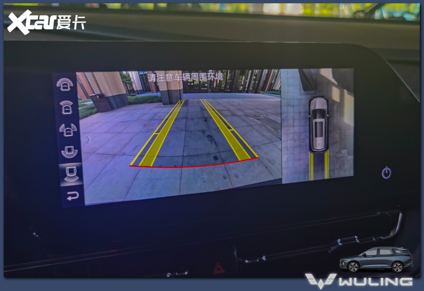 五菱凯捷全系标配了倒车影像和雷达,中高配车型上配有360度全景影像。影像显示清晰,延迟小,并且支持多视角,还将外后视镜的位置标出方便驾驶者判断。这个价位里能把驾驶辅助影像做到这么细致、实用,实属难得。这么大的车盲区很多,全景影像解决了很多问题,值得称赞!